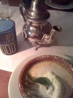 Starters of Moroccan soup with lamb and couscous salad with paprika, aubergine and carrot were accompanied with fresh bread, olives, toasted bread and a tomato, olive oil topping. The main course consisted of chicken with roasted potatoes and olives for me and lamb with dried fruit and almonds for my friend, Anna. Both were well cooked, deliciously seasoned and attractively presented.