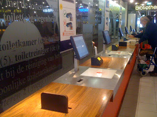 Now if you are like most people, one day you will forget to take a library book back on time or you will want to rent a dvd, which incurs a small lending fee. After all the fun with the return and check out machine, it is understandable that paying your fee to a human being could be a disappointing proposition for you but the Rotterdam Library has thought of that as well! Enter, spaceship feature number three…the paying machine! Just hold your card in front of the scanner and the computer will tell you how much you need to pay and you can pay right there and then. No human interaction needed.